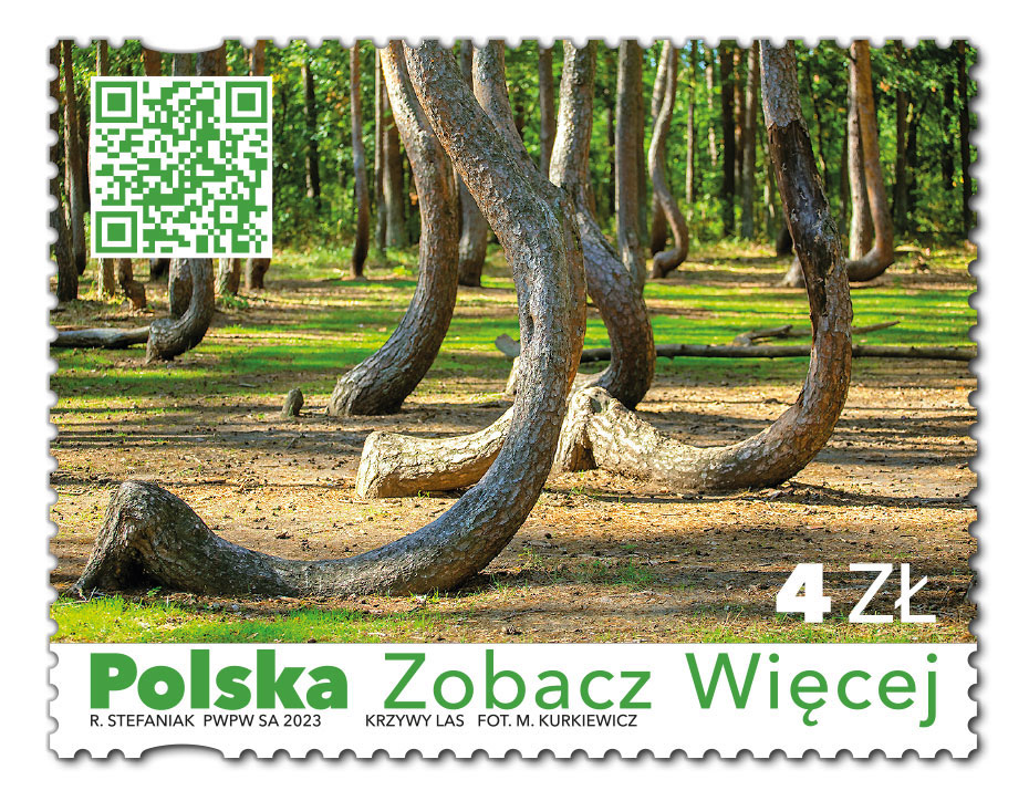 Krzywy Las znalazł się na nowych znaczkach Poczty Polskiej wyemitowanych w ramach cyklu „Polska Zobacz Więcej”. Walory, uzupełnione o kod QR, mają być atrakcją nie tylko dla filatelistów, ale także dla osób zainteresowanych podróżami i ciekawymi zakątkami naszego kraju.
