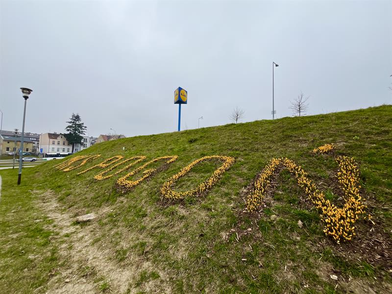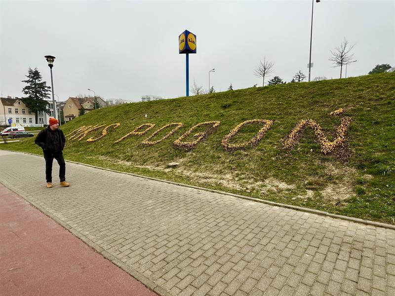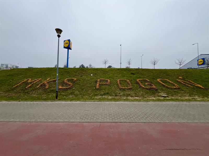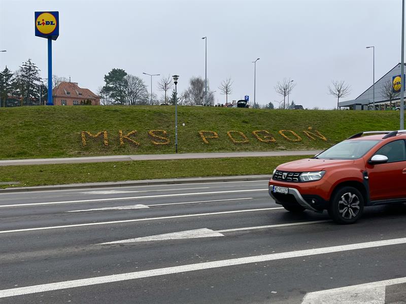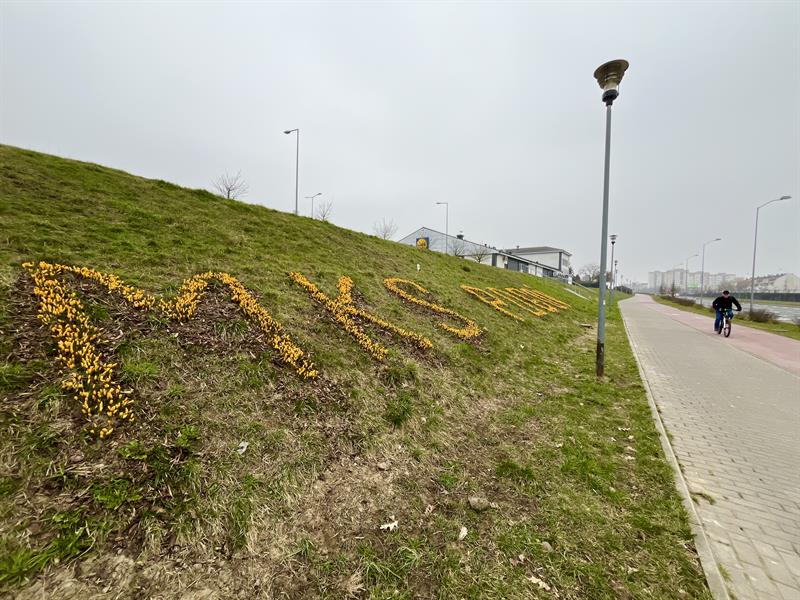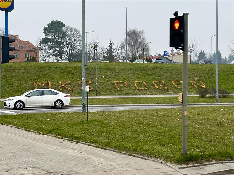 Na skarpie ul. Przyjaciół Żołnierza, tuż przy skrzyżowaniu z ul. Krasińskiego, z daleka widać żółty napis MKS POGOŃ. To nietypowy kwiatowy dywan, rozkwitający 11 tysiącami krokusów.