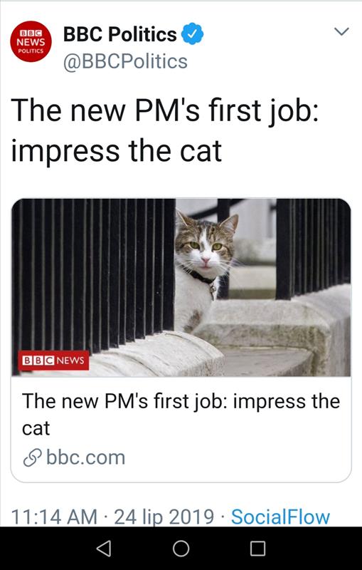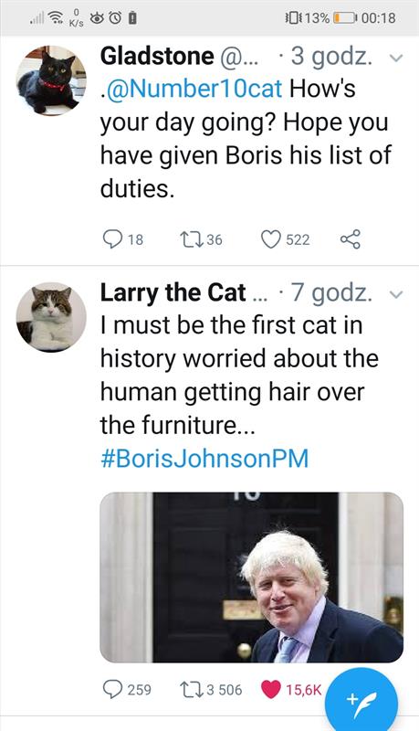 Kiedy stało się jasne, że premier Wielkiej Brytanii Teresa May ma już dość brexitowych bojów i odchodzi ze swojego stanowiska, a tym samym z - przyznajmy dość skromnej - siedziby przy Downing Street 10 w Londynie (to z pewnością jeden z najsłynniejszych adresów na świecie), a jej miejsce zajmie w lipcu nowy szef Partii Konserwatywnej, wtedy Larry the Cat napisał na swoim koncie na Twitterze: „Ciekawe kto zostanie moim nowym lokajem?" i podał nazwiska (wówczas jeszcze) dziesięciu kandydatów. Dziś wiemy już, że nowym „lokajem" Larry'ego został wielki oryginał, barwna postać brytyjskiej sceny politycznej, człowiek, o którym powiedzieć, że jest kontrowersyjny, to nic nie powiedzieć, mianowany w środę prze królową na urząd premiera - Boris Johnson. O ile jednak Johnson może sobie rządzić krajem, o tyle na Downing Street bezapelacyjnie szefem jest wspomniany Larry, dwunastoletni kocur przygarnięty dziewięć lat temu z jednego z londyńskich schronisk i mianowany na starożytną i wielce szanowaną posadę Chief Mousera w siedzibie premiera.