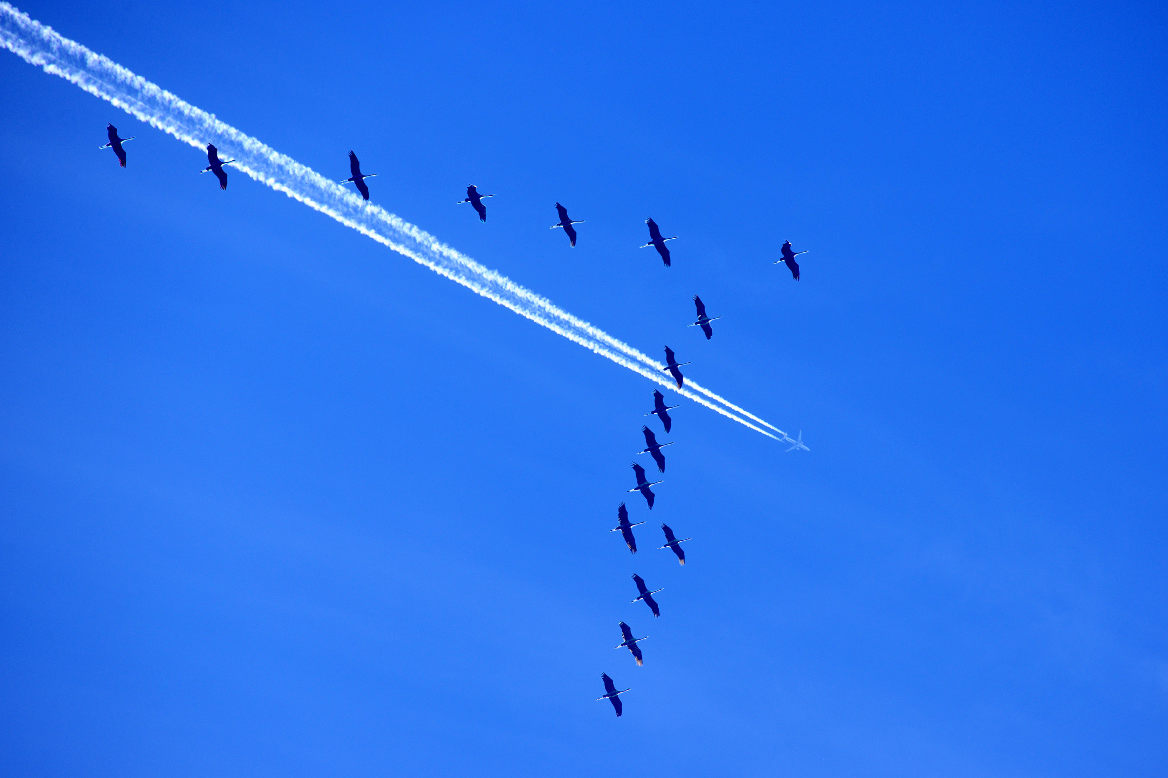 Samolot zapewne leci z Goleniowa do stolicy, ale gdzie leci ten klucz? Mamy październik, więc prawdopodobnie żurawie kierują się ze Skandynawii lub Polski na Półwysep Iberyjski.