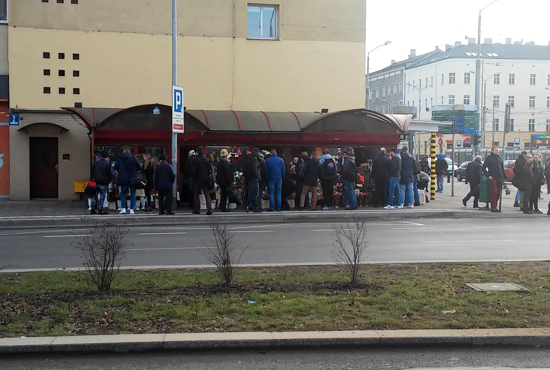 A jednak Dzień Kobiet przetrwał. Z tego co widać na zdjęciu ma się całkiem, całkiem. 8 marca obserwowaliśmy licznych panów biegnących do pracy z symbolicznym kwiatkiem dla koleżanki, a po pracy ustawiających się ponownie w kolejce, aby kupić roślinę dla swoich żon i dziewczyn. To scenka uchwycona przy minikwiaciarniach na Bramie Portowej w Szczecinie. (b)