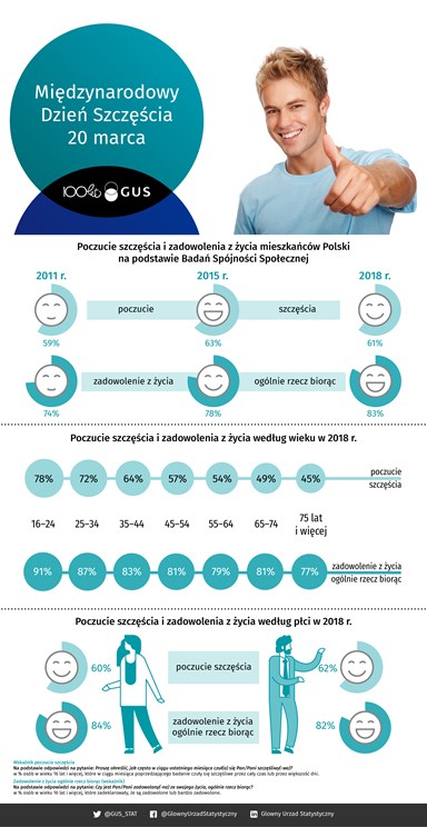 ONZ od 2012 roku przygotowuje wykorzystujący dane statystyczne World Happiness Report, który ocenia poczucie szczęścia mieszkańców poszczególnych krajów świata. Raport opiera się na takich wskaźnikach, jak PKB, pomoc socjalna, oczekiwana długość życia w zdrowiu, wolność dokonywania wyborów życiowych, hojność, postrzeganie korupcji. W opublikowanym w środę raporcie (World Happiness Report 2019) Polska zajęła 40 miejsce na 156 krajów, przesuwając się o 2 pozycje do góry w porównaniu z rokiem ubiegłym. Na pierwszym miejscu pozostała Finlandia.