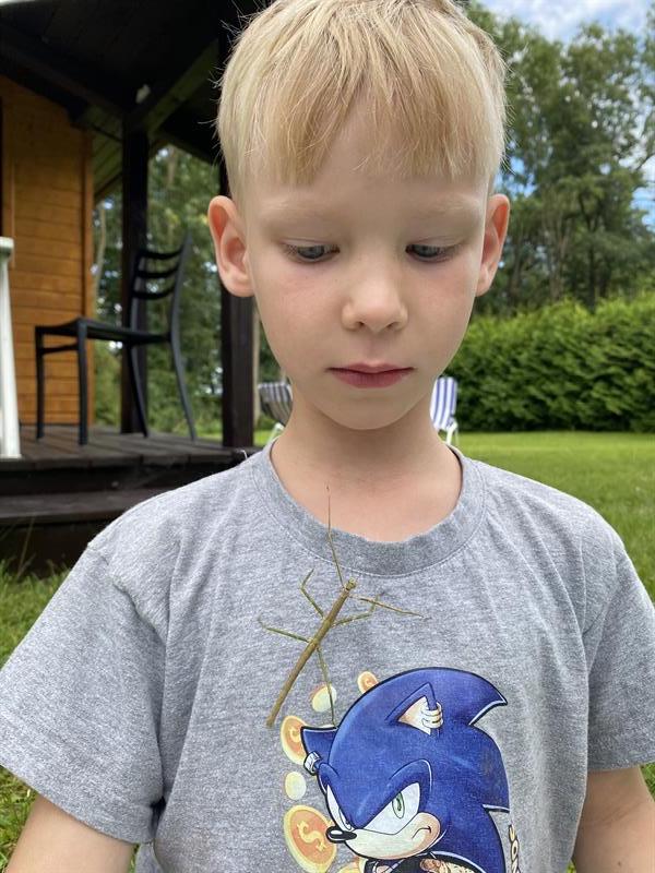 Moje patyczaki lubią jeść liście jeżyn. Mam ich cztery, a mój starszy brat jeszcze dwa. Największy z nich lubi dużo chodzić. Wyjmujemy go z terrarium i pozwalamy mu chodzić po naszych rękach i po głowie. To dotykanie gilgocze. Nasze patyczaki wyglądają jak patyki. Zmieniają kolory. Najładniejsze są w kolorze zielonym. Mają sześć odnóży. Bardzo je lubię.