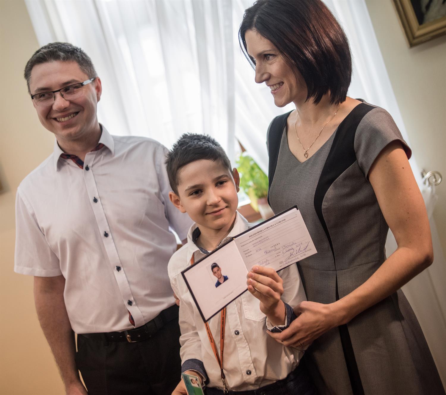 Na zdjęciu: Kamil Wroński z symbolicznym indeksem Politechniki Lubelskiej. Obok rodzice chłopca – Joanna i Patryk.