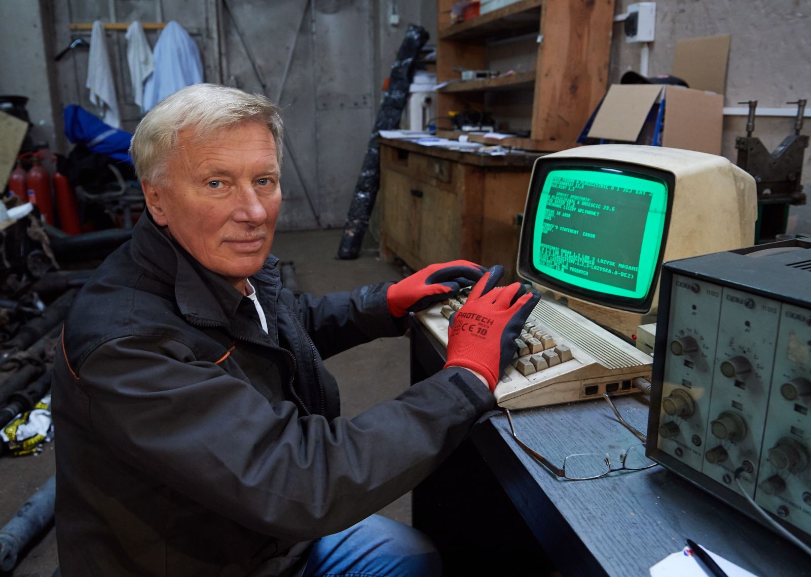 Inżynier Jerzy Zygmunt pracuje przy 26-letnim komputerze Commodore 64 w swoim warsztacie serwisującym wały napędowe w Gdańsku Wrzeszczu. Komputer z monitorem Neptun 156 i wzmacniaczem są elementami samodzielnie skonstruowanej wyważarki wałów napędowych. Commodore 64 nie jest produkowany od 1993 r.