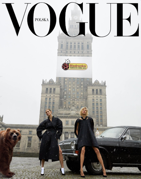 Owszem, sama na widok tej fotki rzucałam słowem nieparlamentarnym, nie da się ukryć, mam świadków, którzy w każdej chwili mogą zeznać na moją niekorzyść! Ale czy można się dziwić mojej i nie tylko mojej emocjonalnej reakcji? Oto bowiem historyczny pierwszy polski numer „Vogue” ozdobiony jest wizerunkiem dwóch znanych modelek – Małgosi Beli i Ani Rubik, który to wybór – oprócz żywo w pewnych kręgach rozważanej kwestii, czy panie mają nogi proste czy proste inaczej – większych kontrowersji nie budzi. Za to tło, na którym je ustawiono… fiu, fiu! Co my tu widzimy, proszę wycieczki?! Tak! Pałac Kultury i Nauki w Warszawie, czyli hojny dar od narodu radzieckiego i osobiście od Józefa Stalina dla bratniego ukochanego narodu polskiego. No po prostu symbol współczesnej Polski! Ale jakby tego było mało, dodano jeszcze jeden pikantny rekwizyt – czarną wołgę, czyli auto radzieckiej produkcji. Panie prezenterki ubiorów odziane są w czarne płaszcze i przy tej wołdze wyglądają oczywiście jak agentki bezpieki. Całość jest szara, bura i ponura jak rzeczywistość w ponadczasowo reżimowej Polsce, a już w Polsce Kaczyńskiego szczególnie. Przekaz dość prosty i dość żałosny. Potem dowiadujemy się jeszcze, że niemiecki fotografik, pan Teller, twórca tej wybitnej okładki, podczas wizyty w Warszawie zobaczył PEKiN, „poczuł jego niesamowitą energię”, no i… mamy efekt. Oczywiście z punktu widzenia wydawców polskiej edycji „Vogue” cała awantura wokół okładkowego zdjęcia jest absolutnym sukcesem i doprawdy trudno im nie pogratulować. Zrobić coś brzydkiego i znakomicie sprzedać produkt? Szacun! Ale tantiemy ze sprzedaży powinny też trafić do spadkobierców Stalina i konstruktorów wołgi… Inna sprawa, że okładka okazała się niezwykle inspirująca i internety natychmiast zaroiły się od jej przeróbek (jest też akcent szczeciński). Poczucie humoru w narodzie nie ginie!