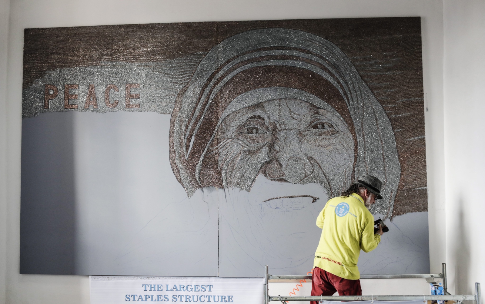 Miesiąc pracował w Prisztinie w Kosowie nad mozaiką przedstawiającą matkę Teresę z Kalkuty albański artysta Saimir Strati. Na mającą 10 metrów kwadratowych mozaikę składa się 1 500 000 zszywek. Ta rekordowa, największa na świecie mozaika ze zszywek jest umieszczona wewnątrz kosowskiego muzeum narodowego.