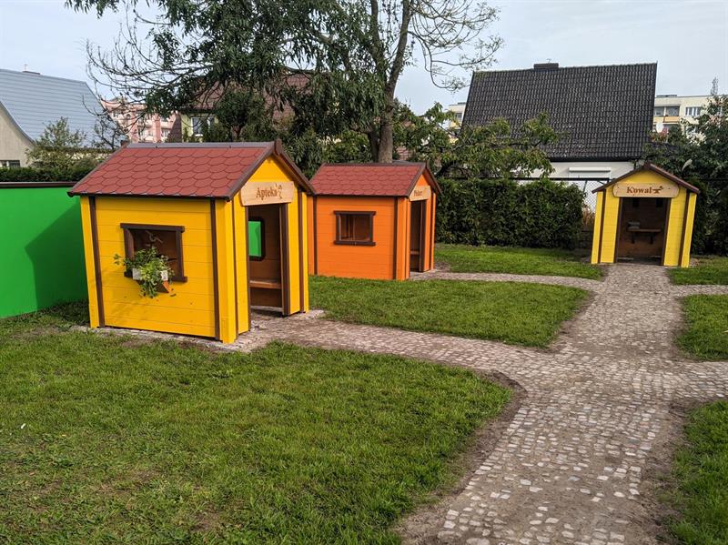 Ciekawy zakątek do zabawy pojawił się też przy PM nr 6 na os. Chopina, gdzie wzdłuż miniaturowych uliczek stanęło 5 domków, które nawiązują do dawnych rzemiosł. Jest tam m.in. chatka kuśnierza, szewca czy złotnika. Dodatkowo w każdym domku są narzędzia typowe dla danego zawodu.
