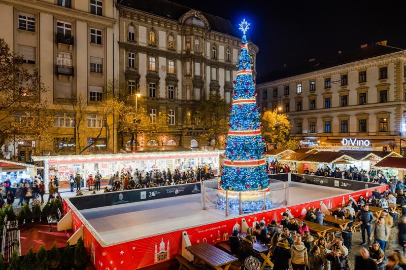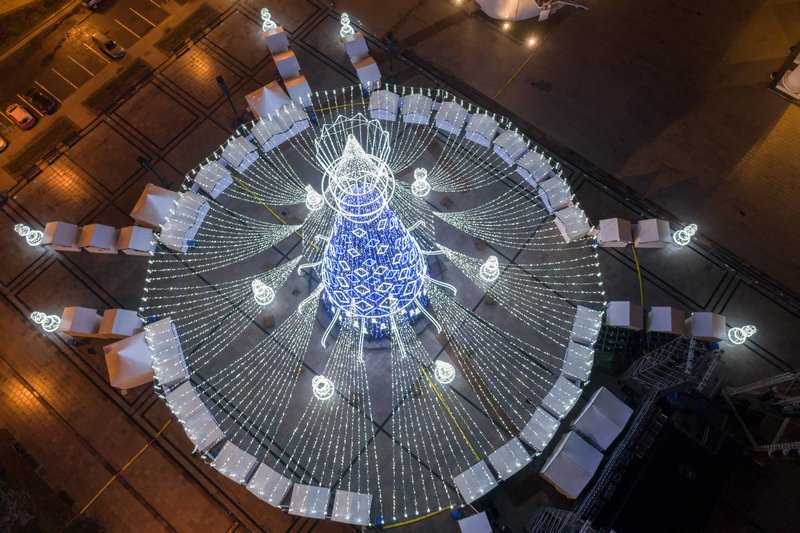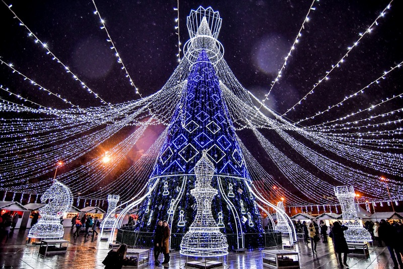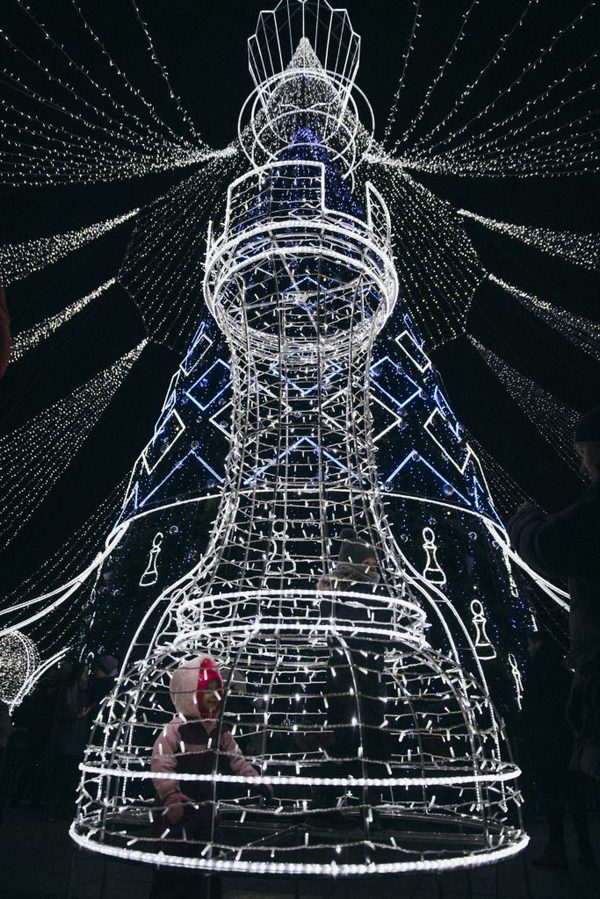 Wokół choinki rozlokował się bożonarodzeniowy jarmark, który zdobią neonowe kilkumetrowe figury szachów. Świąteczna kompozycja ze straganami zajmuje 2,5 tys. m kw. i będzie dostępna do 7 stycznia.