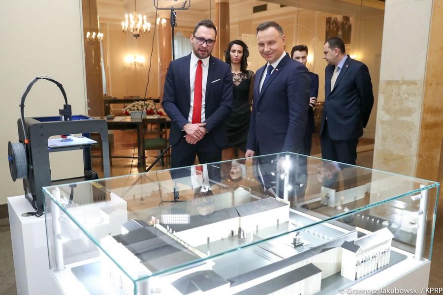 Prezydent Andrzej Duda gościł w poniedziałek 29 stycznia w Pałacu Prezydenckim przedstawicieli firmy Zortrax SA, na czele z jej prezesem Rafałem Tomasikiem – laureatów Nagrody Gospodarczej Prezydenta RP. Olsztyńska spółka podarowała Andrzejowi Dudzie wyjątkową makietę Pałacu, stworzoną w technologii druku 3D.
