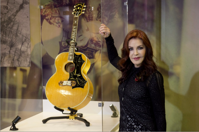 Priscilla Presley, była żona Elvisa, pozuje z gitarą Gibson J-200 na wystawie w Londynie. Ekspozycja została wzbogacona o kilka nowych elementów, w tym właśnie o tę gitarę i garnitur króla rock and rolla z jego ostatniego występu w 1977 roku.