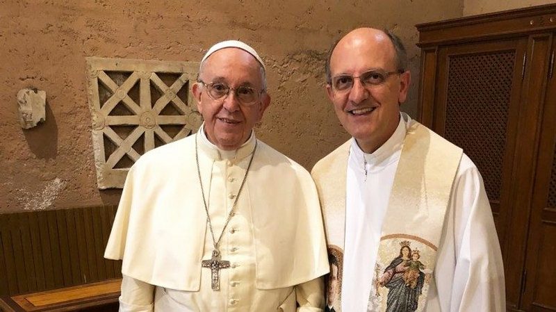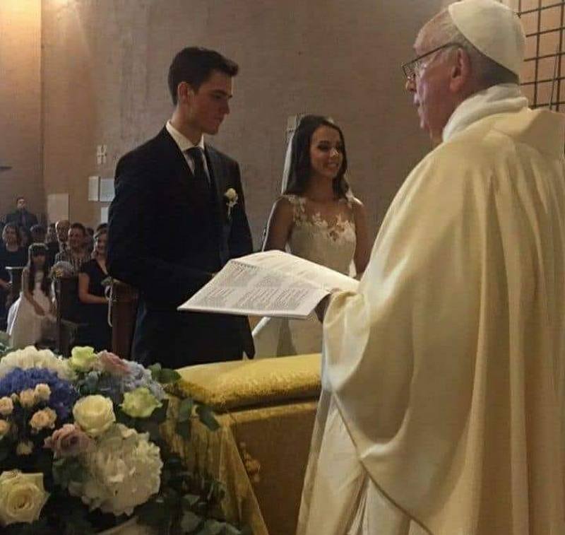Państwo młodzi, ich świadkowie oraz rodziny zgromadzili się w kościele świętego Szczepana koło bazyliki świętego Piotra, gdzie czekali na brazylijskiego księdza, który miał udzielić im ślubu. Ojciec Renato dos Santos powiedział, że gdy przyszedł do zakrystii, by się przygotować, zaskoczony zobaczył tam siedzącego uśmiechniętego papieża.