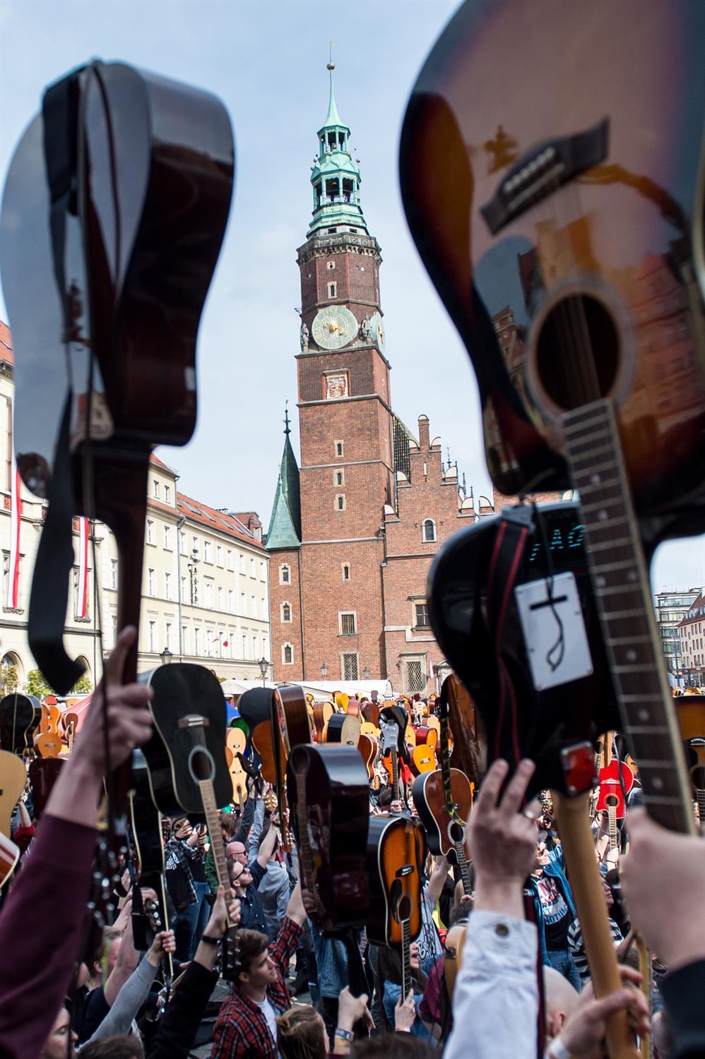 Miłośnikom gitarowych dźwięków, zgromadzonym w niedzielę na wrocławskim Rynku ( wśród nich był m.in. amerykański wirtuoz gitary Al di Meola), udało się pobić ustanowiony w 2014 r. gitarowy Rekord Guinnessa. "Hey Joe" wspólnie zagrało 7356 gitarzystów; to o 12 więcej niż dwa lata temu. Fot. PAP/Maciej Kulczyński
