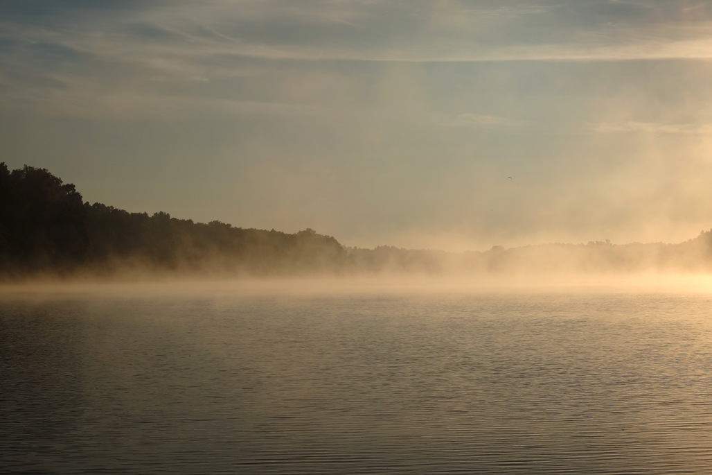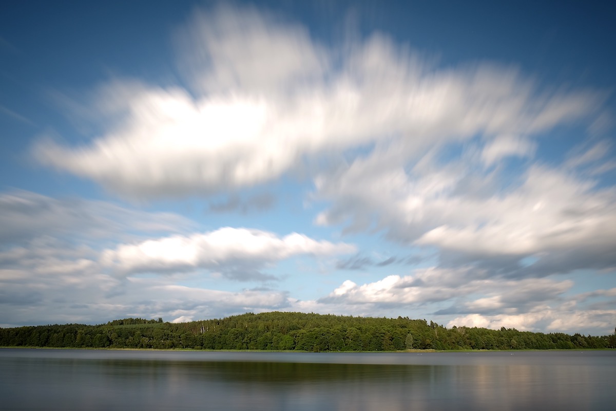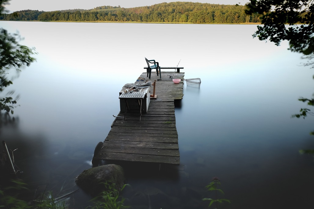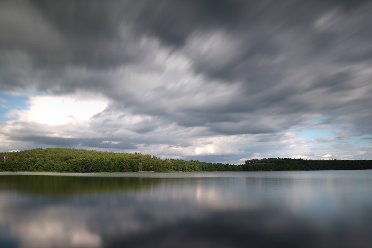 Siecino na Pojezierzu Drawskim. Pogodna nie rozpieszczała, początek wakacji był zimny, deszczowy i wietrzny. Nad jeziorem Siecino przetaczały się po niebie ogromne, kłębiaste chmury, zapowiadające kolejną deszczową noc. Pięknie wyglądają na zdjęciach. Ryby nie brały, więc statyw na pomoście bardziej się przydał do aparatu niż do trzymania wędek. Gdy pogoda się poprawiła, przestało padać i wyszło słońce, o 5 rano rybacy wypłynęli na jezioro, ryby zaczęły brać.