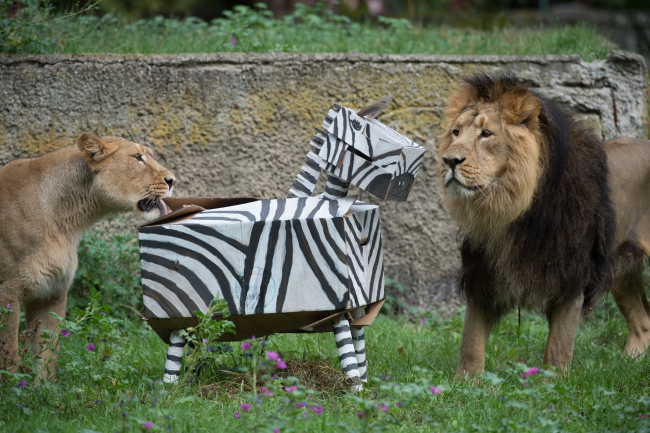Pracownicy łódzkiego Ogrodu Zoologicznego postanowili urozmaicić życie lwów, dostarczając im posiłek podany w wykonanych z kartonu imitacjach zwierząt. Lwy mogły zapolować na "zebrę". Fot. PAP/Grzegorz Michałowski