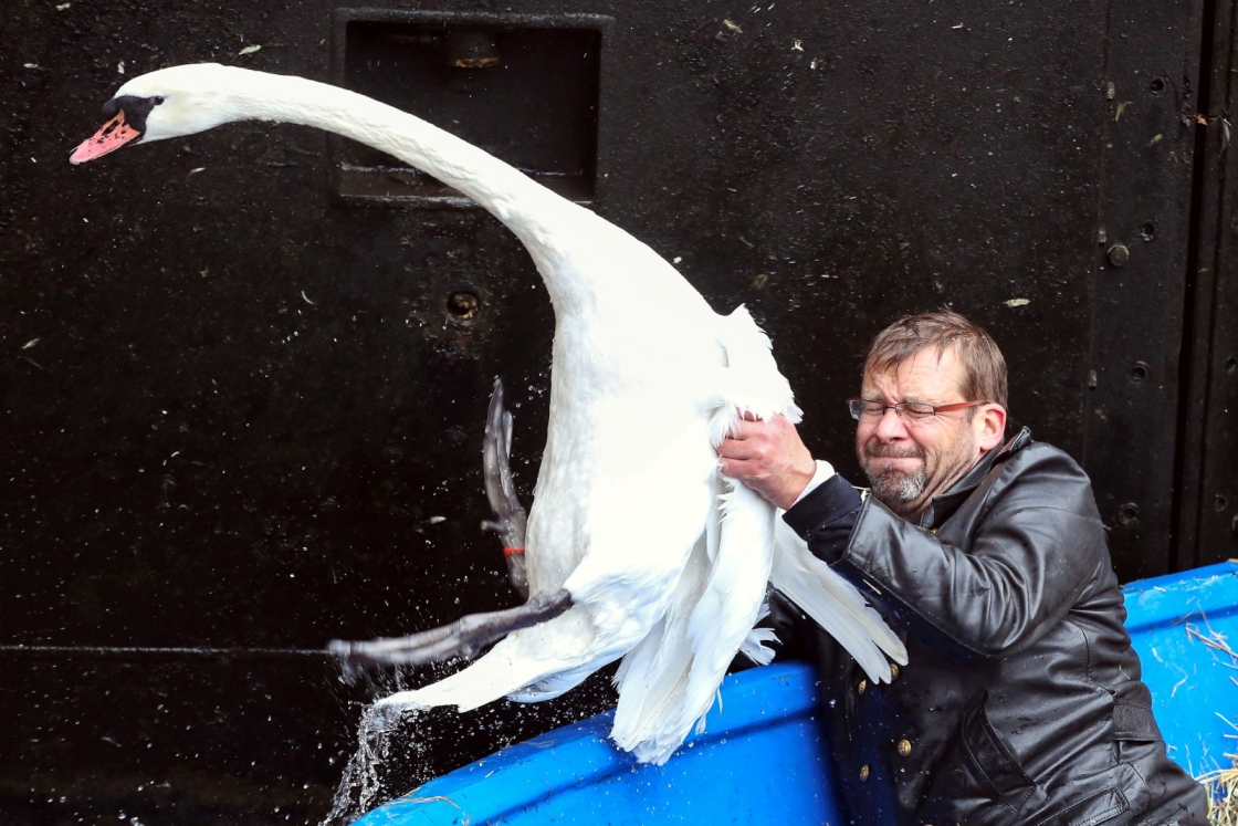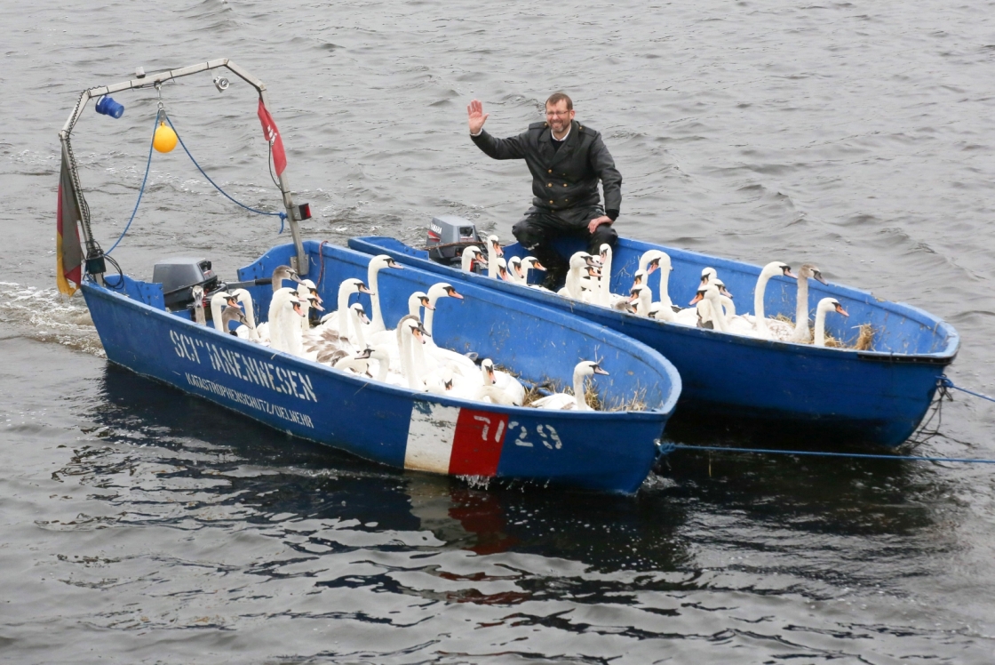 Olaf Niess łapał łabędzie na rzece Alster w Hamburgu, by przetransportować je do zimowisk, które nie zamarzną na zimę. Ptaki pozostaną tam do wiosny.