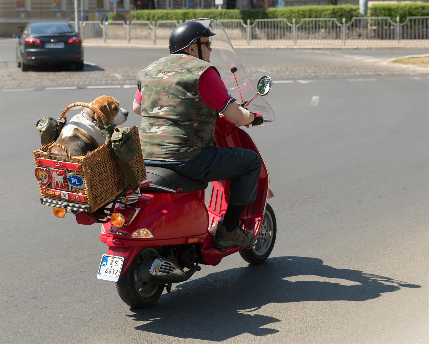 Ciekawie, wygodnie, a najważniejsze, że w doskonałym towarzystwie. Wspólna podróż z panem na skuterze to jest to, co niektóre psy lubią najbardziej...