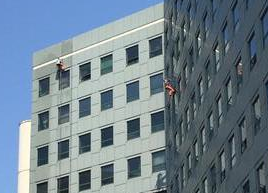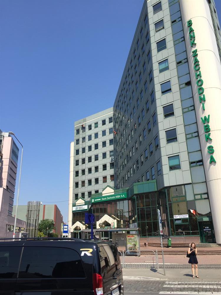 Żar się z nieba leje, a ZUS w Szczecinie musi lśnić. Mycie elewacji na takiej wysokości i w takiej temperaturze to sport ekstremalny. Ciekawe jak będą wyglądać efekty tego wyczynu? ©℗