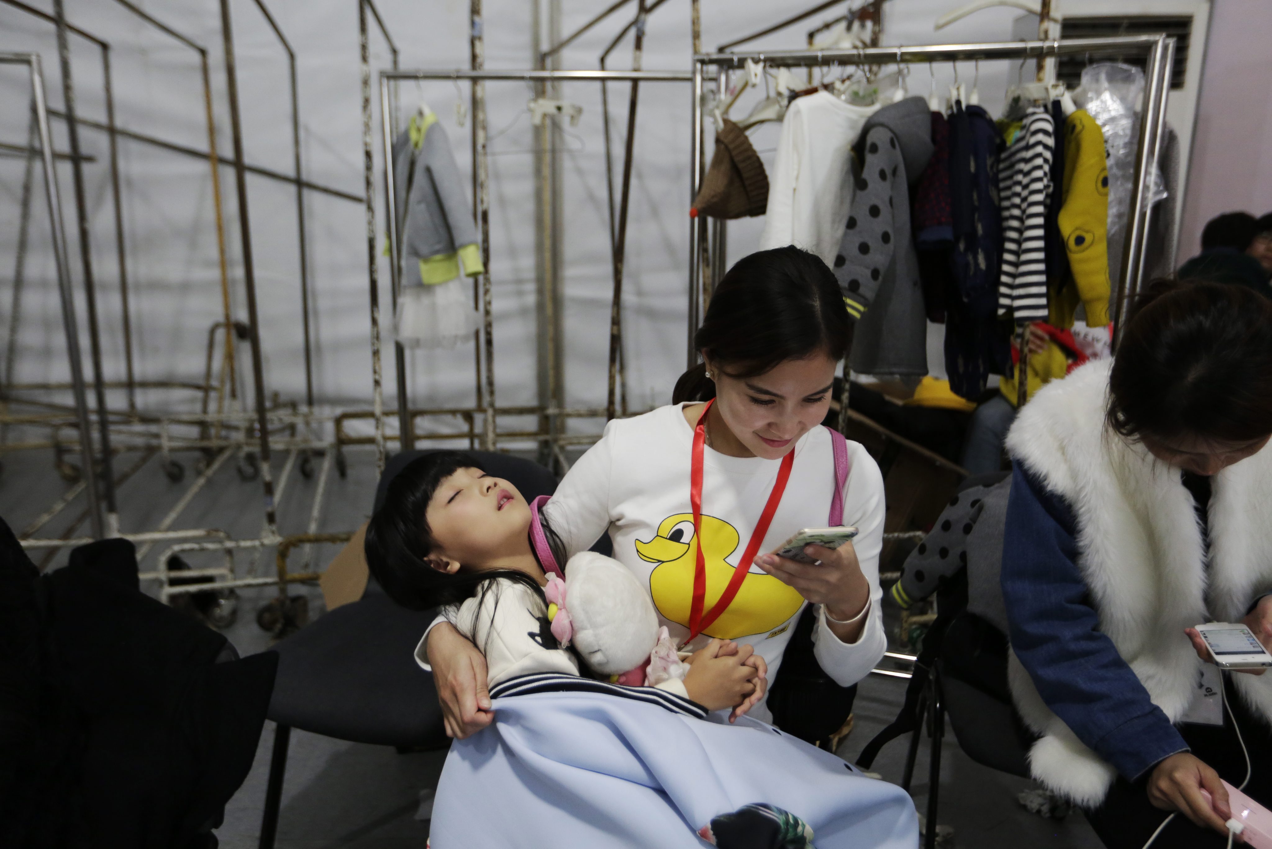 Mała modelka zasnęła w ramionach matki, tuż przed swoim występem "na wybiegu", podczas tygodnia mody w stolicy Chin Pekinie. Kobieta w tym czasie sprawdza wiadomości w smartfonie. Kompozycję zdjęcia dopełniają w większości puste metalowe wieszaki umieszczone w przebieralni, skąd już tylko krok do wielkiego świata mody.