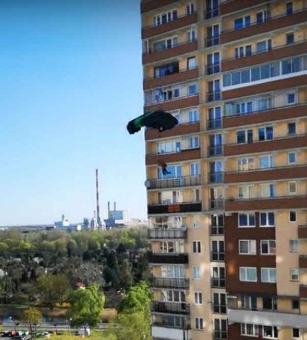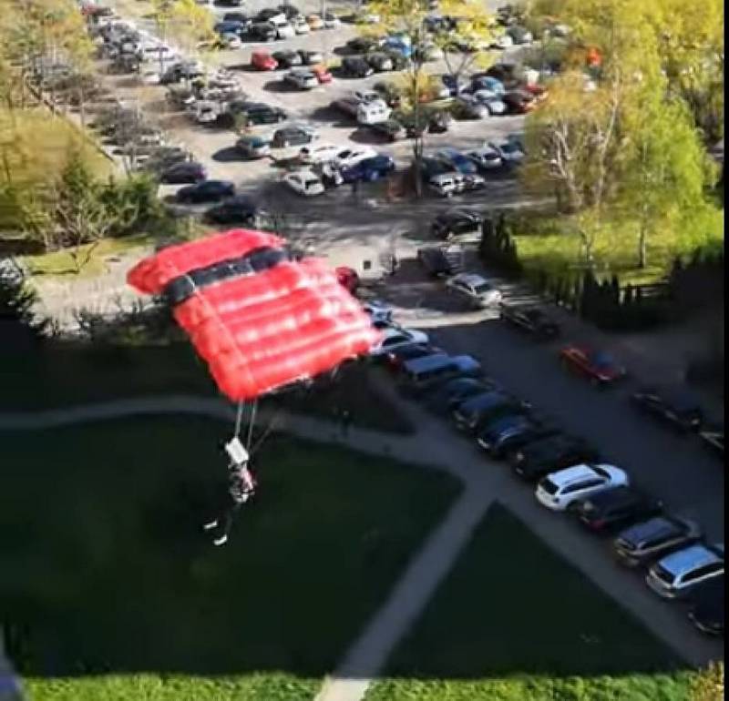Dwóch śmiałków wyskoczyło ze spadochronem z dwudziestego piętra wieżowca na warszawskich Bielanach. Ich wyczyn telefonem komórkowym sfilmowali mieszkańcy sąsiedniego bloku.