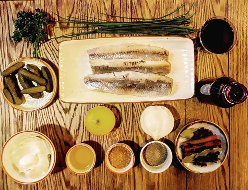Składniki: śledzie solone – płaty 3-4 szt., zalewa: wytrawne wino czerwone – 200 ml, naturalny zakwas buraczany – 200 ml, ocet jabłkowy – 20 ml, miód – 2-3 łyżki, cukier trzcinowy – 1 łyżka, kora cynamonu – 1 szt., gwiazdki anyżu – 2 szt., liść laurowy – 3 szt., ziele angielskie – 1 łyżka, goździki – 1 łyżka, sos tatarski: majonez (najlepiej własnoręcznie przygotowany) – 4 łyżki, jogurt naturalny – 1 łyżka, korniszony pokrojone w kostkę – 3-4 szt., średniej wielkości cebula pokrojona w kostkę, szczypiorek – pół pęczka, łyżeczka soku z cytryny, sól, pieprz do smaku.