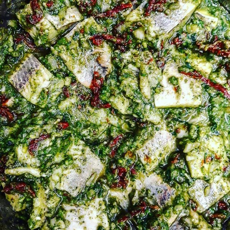 ŚLEDŹ W SZCZYPIORKOWYM PESTO, Z SUSZONYMI POMIDORAMI (dobrze komponuje się na tle choinki – żartuje p. Andrzej…)