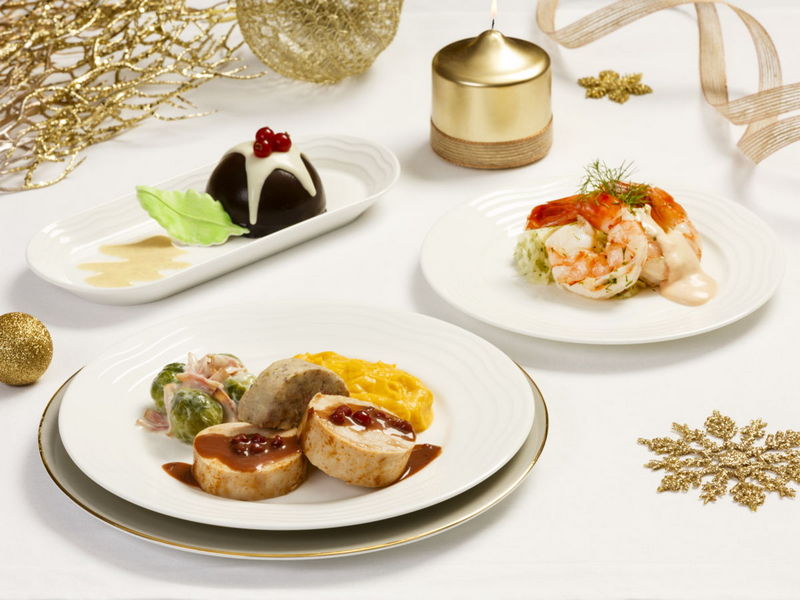 Podróżujący klasą pierwszą lub biznes rozpoczną ucztę od krewetek królewskich marynowanych w cytrynie i ziołach, z sosem koktajlowym i surówką z kopru włoskiego. Następnie będzie czekać na nich dani główne - rolada z piersi indyka nadziewanej kasztanami i morelami, podawanej z sosem żurawinowym jus lié, purée z dyni i brukselką, plastrami indyka i śmietaną. W zależności od trasy na deser serwowana będzie rolada piernikowa, ciasto czekoladowo-miętowe lub ciasto bûche de Noël.