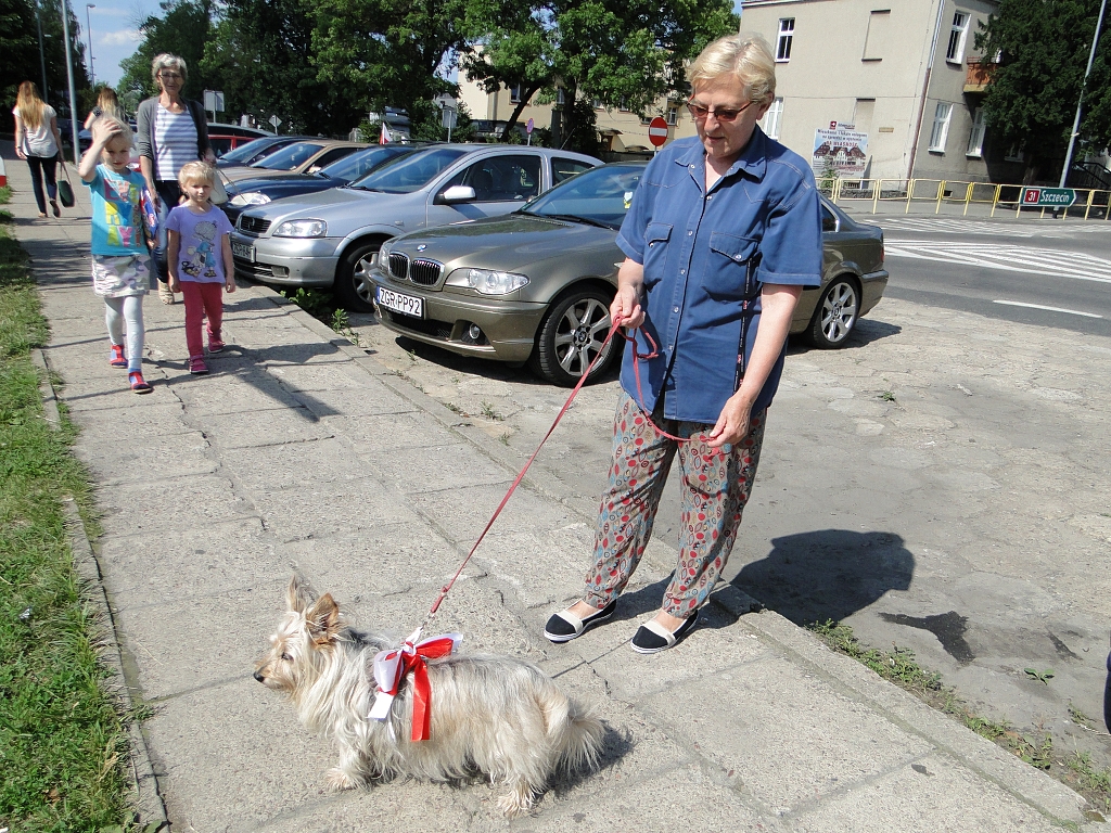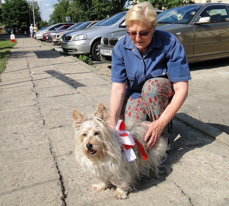 Uwagę gryfinian zwraca spacerujący ze swoją panią kudłaty piesek przybrany w kokardkę w narodowych barwach.
