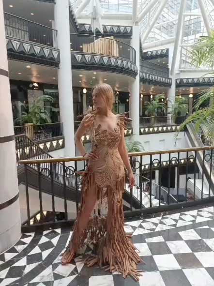 Suknia przesłana Lady Gadze jest kreacją typowo sceniczną: całość jest wykonana z beżowej koronki, góra stroju jest gorsetowa, dół asymetryczny. Suknia jest długa. Gorset ma ozdobny, drewniany stanik w stylu nawiązującym do strojów wikingów, dół sukni jest ozdobiony dłuższymi kawałkami drewna.