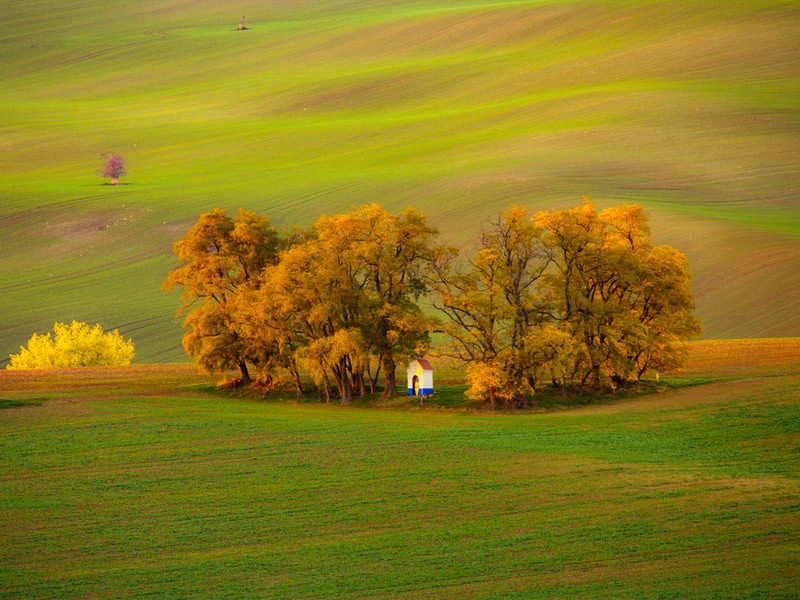 Fotografowie region koło Kyjova nazywają Morawską Toskanią. Długie pasy brązowo-zielonych pól ciągną się aż po horyzont. Pofałdowaną krainę gdzieniegdzie zdobi samotne drzewo czy biała kapliczka.