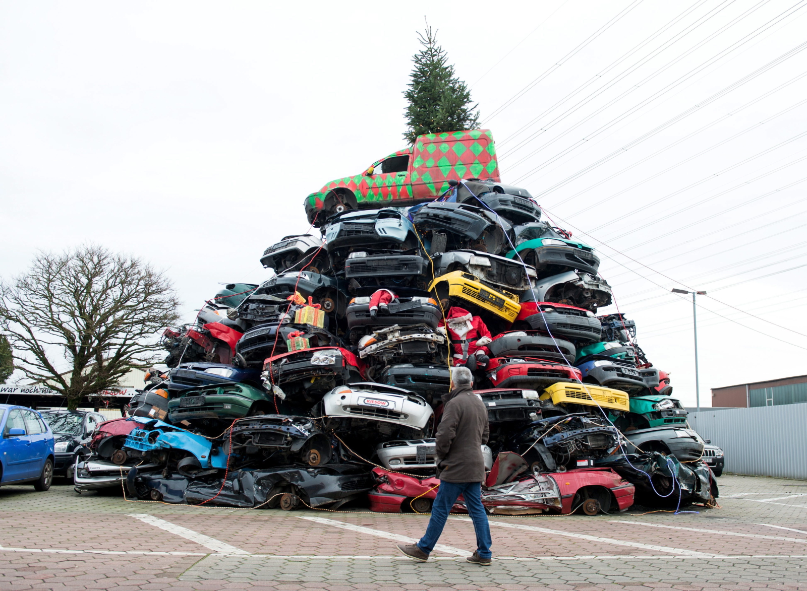 Na wysypisku w Hamburgu ustawiono nietypową choinkę. Składają się na nią wraki samochodów ułożone w stos. Jak widać, nawet w takim miejscu nie zabrakło świątecznych akcentów.