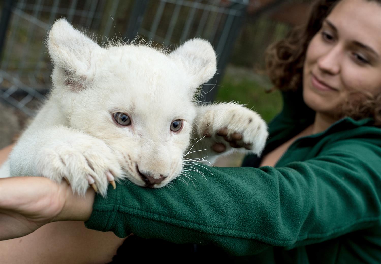 Studentka weterynarii Małgorzata Hussar i Lucky – trzymiesięczny biały lew w Zoo Safari w Borysewie. Lucky to jedyny lew, który ocalał po tym, jak w czerwcu lwica urodziła na wybiegu trójkę małych. Pod okiem lekarzy weterynarii młody lew został zważony i odrobaczony.