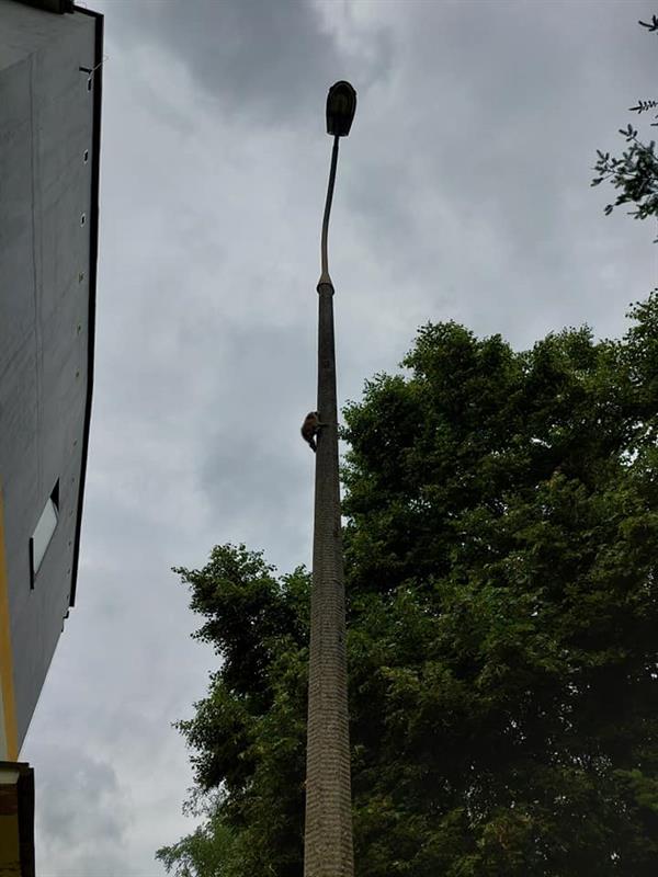 Druhowie z Ochotniczej Straży Pożarnej w Dolicach ratowali szopy. Jeden z nich wlazł wysoko na latarnię i nie mógł z niej zejść.