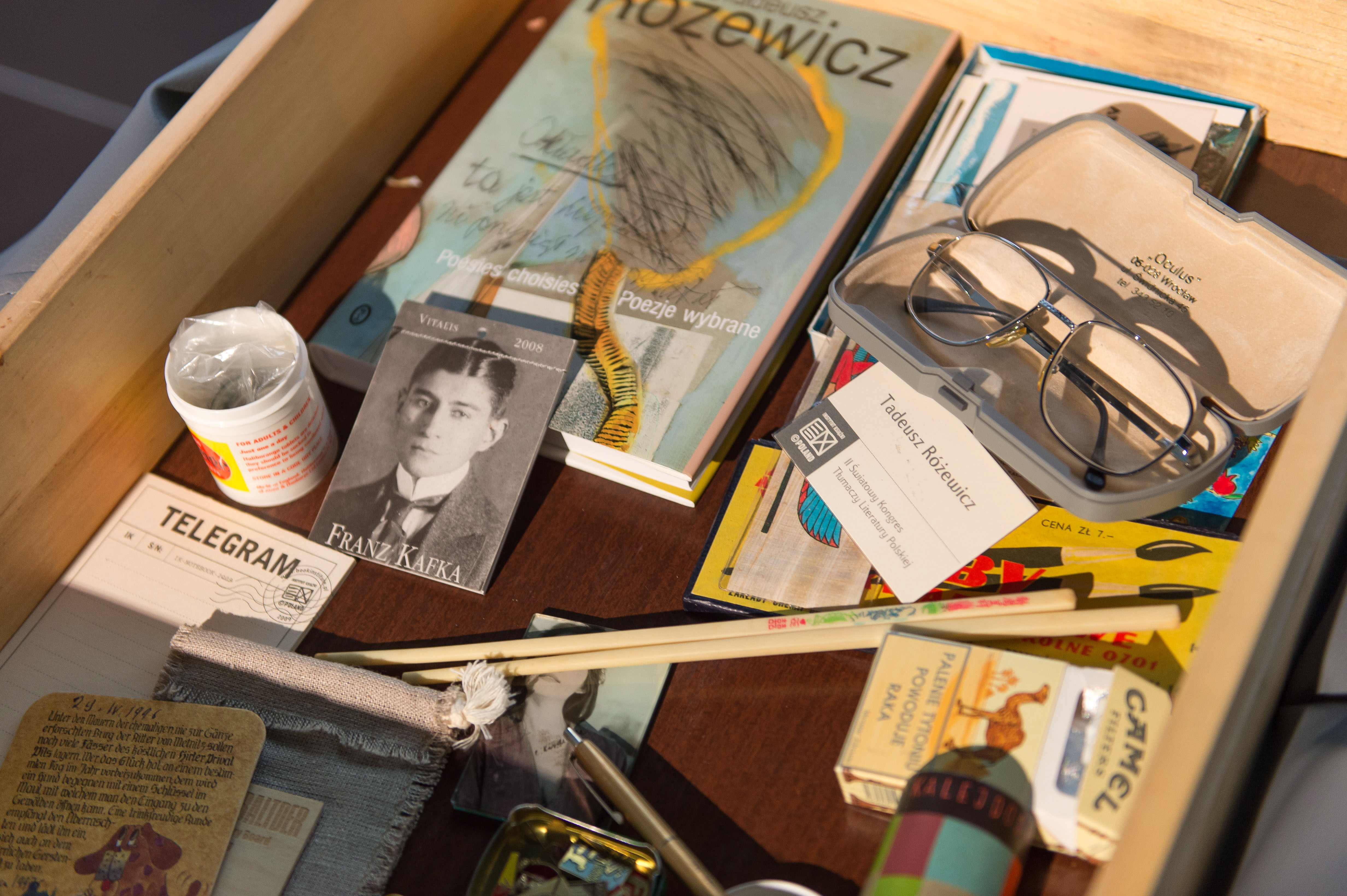 Wnuczka Tadeusza Różewicza, Julia Różewicz, w rozmowie z dziennikarzami mówiła, że w szufladzie znajdują się rzeczy codzienne jej dziadka. - Część z nich pewnie trafiła tam przez przypadek. Jest tam na przykład paczka papierosów, dziadek nie palił oficjalnie, tylko jak ktoś do niego przychodził, to go częstował. Jest tam również kalejdoskop, którym bawiłam się, jak byłam dzieckiem oraz tomik dowcipów o blondynkach. Dziadek był typowym chomikiem, zbierał wszystko, a w domu jest mnóstwo tego typu rzeczy. Biurko z całą zawartością, które znajdowało się w innym pokój, oddaliśmy od Ossolineum, te rzeczy również będą dostępne dla zwiedzających - powiedziała wnuczka.