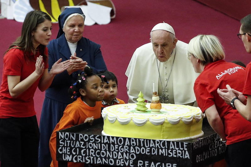 Co roku mistrz cukiernictwa Francesco Ceravolo z położonej koło Watykanu ulicy Borgo Pio przygotowuje dekorację na urodzinowym cieście dla Franciszka ze specjalnym przekazem odnoszącym się do aktualnych wydarzeń. Tegoroczny nawiązuje do Światowych Dni Młodzieży, które odbędą się z udziałem papieża w Panamie 23-27 stycznia, a także do synodu biskupów na temat młodzieży, który odbył się w październiku.
