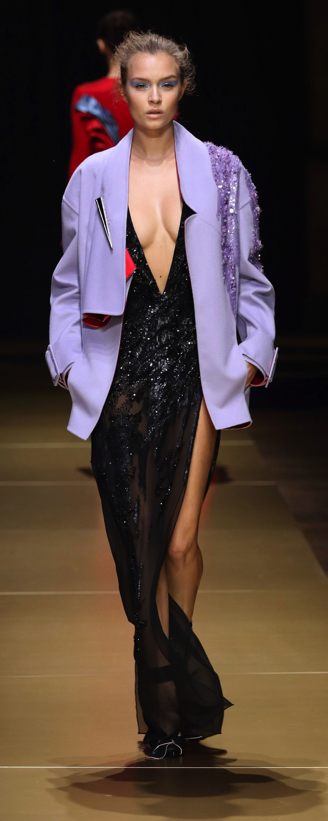 Modelka prezentuje kolekcję zaprojektowaną przez słynną Donatellę Versace podczas tygodnia mody w Paryżu.