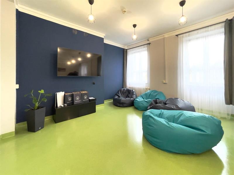 Dla każdego mieszkańca w Strefie Relaksu czeka do dyspozycji 65-calowy telewizor, Playstation, kanapy, stoliki, pufy i w zależności od akademika bilard, piłkarzyki lub dart.