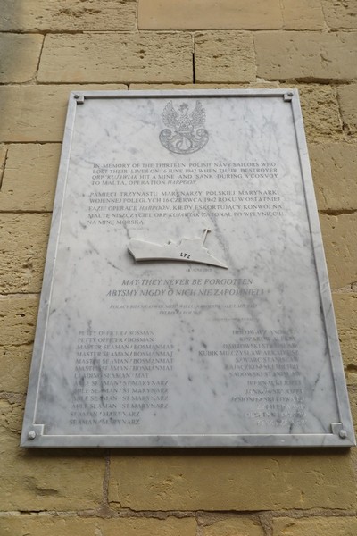 Natomiast w górnych ogrodach Barrakka, z których jest wspaniały widok na maltańskie trójmiasto: Vittoriosa, Senglea i Cospicua, natrafiłam na tablicę upamiętniającą ORP „Kujawiak”. Zatonął on w nocy z 15 na 16 czerwca 1942 r. u wybrzeży Malty po wpłynięciu na niemiecką minę podczas eskortowania alianckiego konwoju. Zginęło 13 członków załogi. Wrak polskiego eskortowca, znajdujący się na głębokości 100 metrów ok. 5 mil morskich od Valletty, w 2014 r. znaleźli członkowie Stowarzyszenia Wyprawy Wrakowe. W minionym roku, podczas 4. międzynarodowej ekspedycji, wydobyli dzwon „Kujawiaka”. ©℗