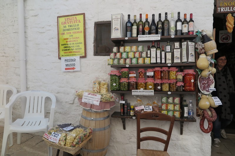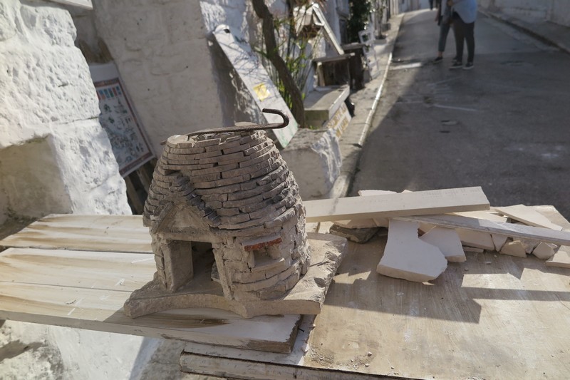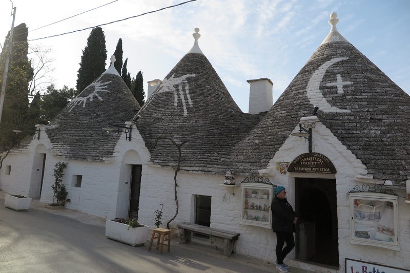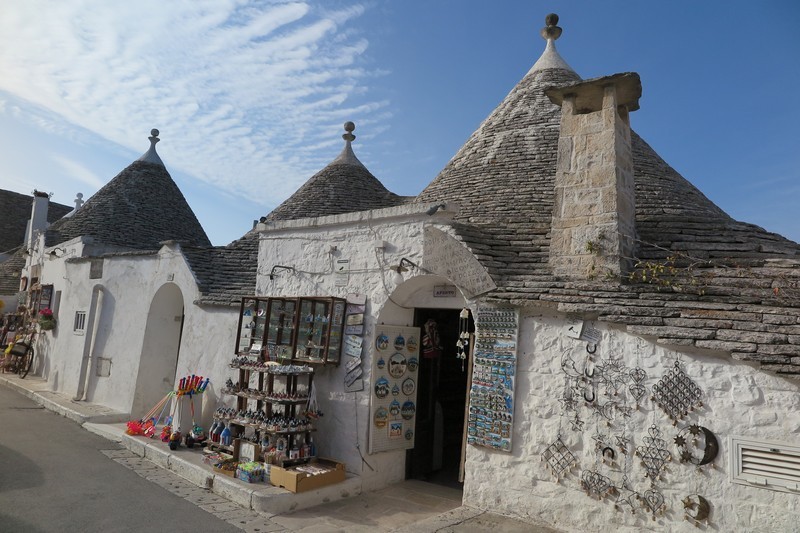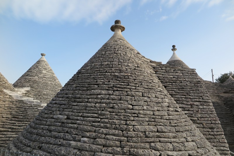 Wapienne chaty bez zaprawy – trulli – były budowane z grubo ociosanego kamienia, którego tam dostatek, jako tymczasowe schronienia i magazyny lub jako stałe mieszkania przez właścicieli ziemskich lub robotników rolnych. Pierwsze powstały już w XIII w. Jedna z hipotez mówi o zmyślności apulijskich chłopów, którym władca zakazywał budowania stałych domostw, by przenosić ich wraz z dobytkiem tam, gdzie będą potrzebni do pracy. Inna, że mieszkańcy dzięki temu mogli nie płacić podatków, bo budynki uchodziły za niewykończone. Jednak wbrew pozorom trullo to solidna budowla o podwójnych ścianach i dwuwarstwowym dachu z wodoszczelnym stożkiem, zwieńczonym szpicem, kulą, krzyżem… Kto się o tym nie przekonał w drodze do Alberobello, to powstawanie trullo zobaczy w warsztatach pokazujących to w miniaturze.