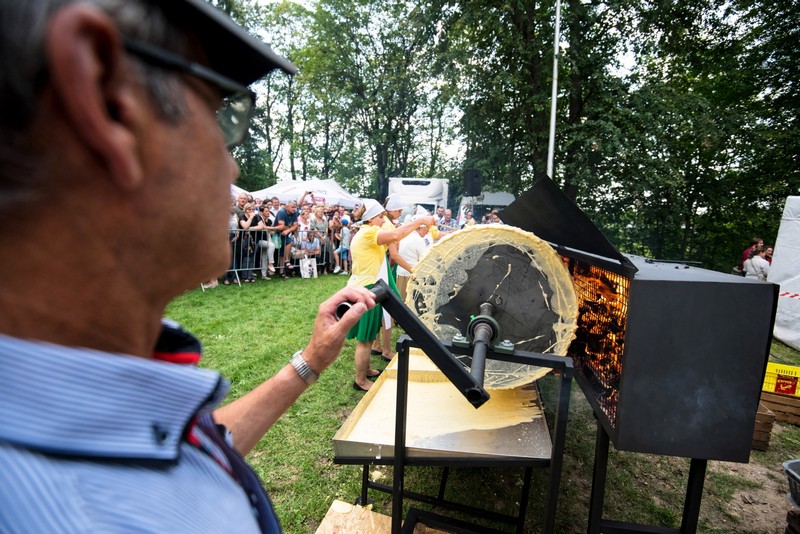 - Wcześniej piekliśmy sękacze mniejsze, półmetrowe, metrowe, a raz jego długość wyniosła dwa metry i dwadzieścia centymetrów. Tak wielkiego jak dzisiaj nie piekliśmy – powiedziała PAP prezes Stowarzyszenia Żytkiejmska Struga Bożena Mikielska. Dodała, że kilka dni temu odbyły się próby pieczenia takiego giganta i obie się udały.