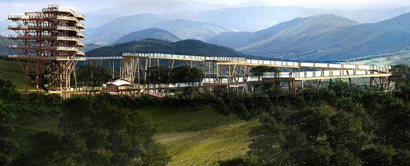 Niezwykła drewniana wieża o wysokości 49,5 metra budowana jest na szczycie stacji narciarskiej Słotwiny Arena (896 m n.p.m) wśród lasów pasma Jaworzyny Krynickiej. Prowadzić do niej będzie specjalna, wznosząca się stopniowo do góry „drewniana ścieżka", ukryta w koronach drzew: buków, jodeł, świerków.