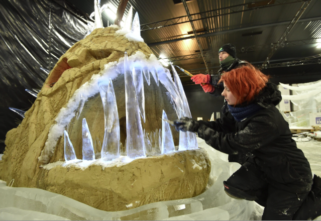W Elstal w Niemczech trwają przygotowania do największej wystawy rzeźb lodowych. Na zdjęciu: łotewscy artyści pracują nad gigantyczną rybą stworzoną z lodu i piasku. Wystawa ma zostać otwarta pod koniec listopada.