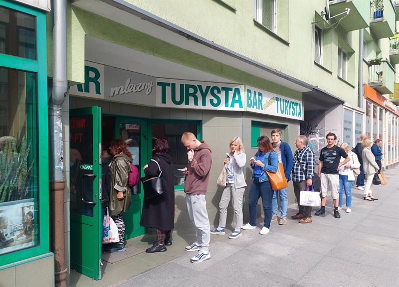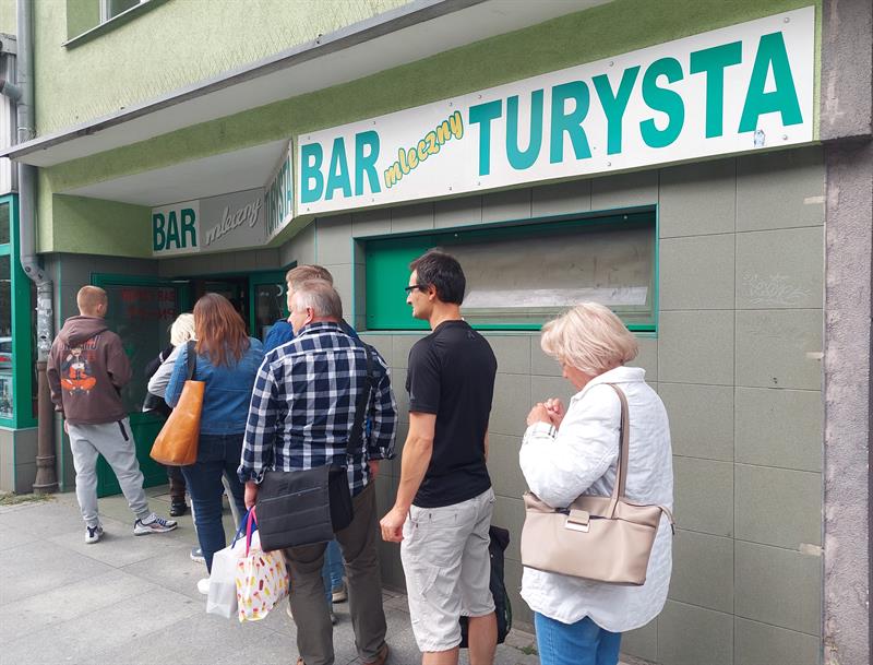 Po schabowe i naleśniki, barszcz czerwony i fasolkę szparagową przyprószoną bułką tartą, ciągną się więc kolejki daleko poza wejście do Turysty. Klienci chwalą, że tu można zjeść jak u mamy, bez kulinarnych eksperymentów a na obiad nie wydać fortuny.