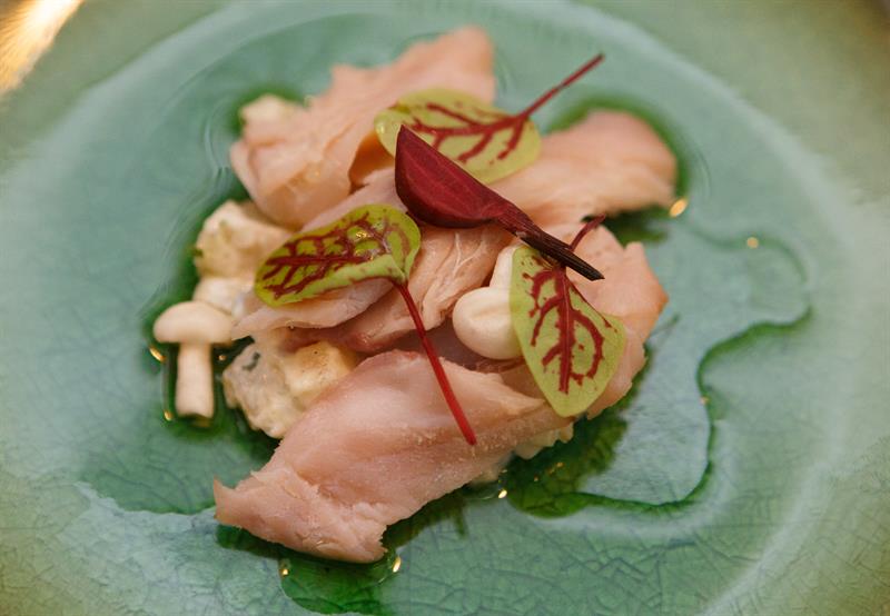 – Do sałatki dodałem, zamiast ziemniaka, topinambur. Jest to korzeń nieco zapomniany, jednak jakiś czas temu powrócił na nasze stoły – mówi M. Siwak. – Dodałem również produkt regionalny, czyli pstrąga z Zielenicy, którego przedtem zakisiłem. Pstrąga można ukisić w takiej samej zalewie jak ogórki. Po tygodniu ryba powinna być ukiszona. Jeśli chcemy przyspieszyć proces kiszenia, można dolać wodę z ogórków kiszonych. Wtedy już po trzech dniach pstrąg będzie gotowy – zdradza szef kuchni restauracji „Park Hotelu”.