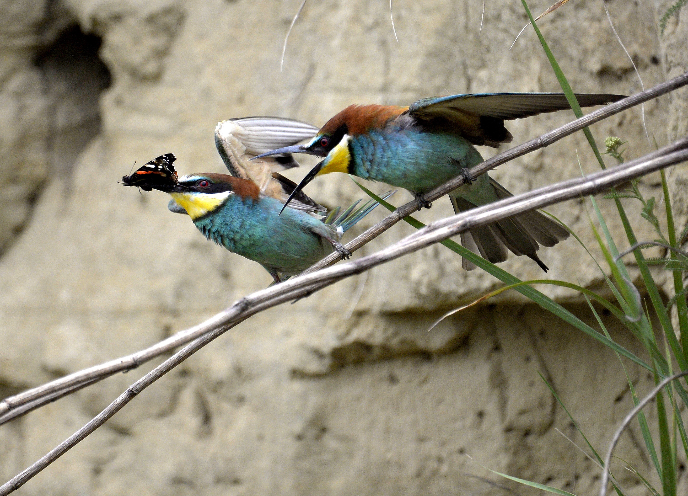 Żołny (Merops apiaster) sfotografowane w Laszkach na Podkarpaciu, to jedne z najbarwniejszych ptaków występujących w Polsce.