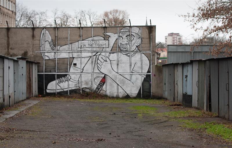 Mural nie na garażowisku ale na murze to raz, po drugie to bardzo ładny mural. Po trzecie symbolizuje zamknięcie artysty i młodego człowieka przez system. System rzeczywiście jest opresyjny na ludzi myślących bardziej wolnościowo i bezpretensjonalnie.