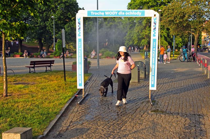 W Kołobrzegu pojawiły się uliczne zraszacze. Wodna mgiełka dawała wytchnienie nie tylko ludziom, ale również, a może przede wszystkim, towarzyszącym im czworonogom. ©℗