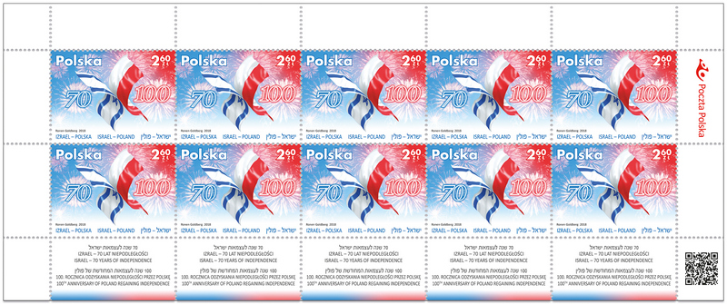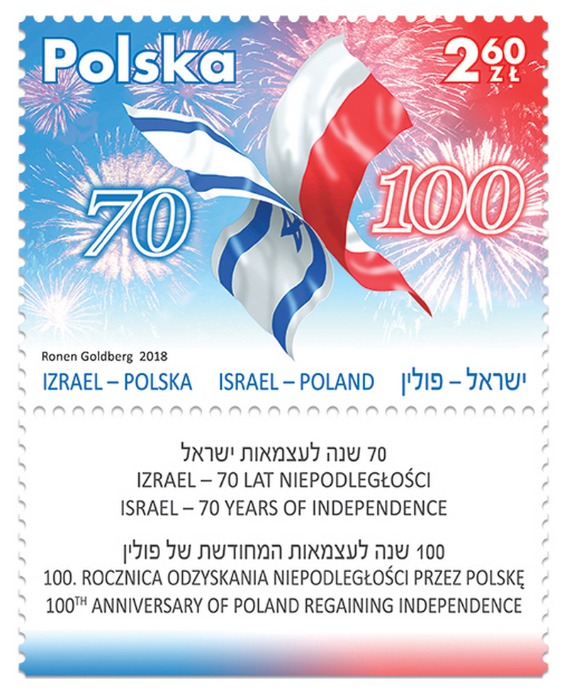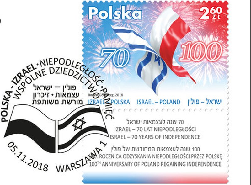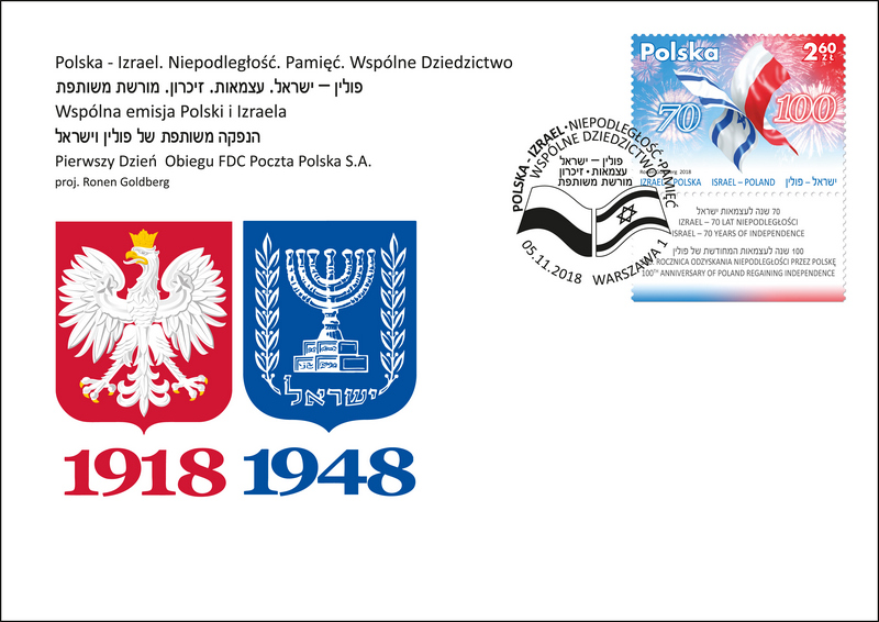 Z okazji 100. rocznicy odzyskania przez Polskę niepodległości oraz 70. rocznicy proklamowania niepodległości Izraela w poniedziałek (5 listopada) do obiegu w obu krajach trafił okolicznościowy znaczek.