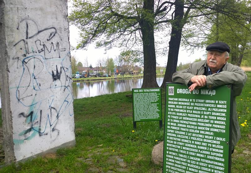 Na zdjęciu: Zbigniew Czarnuch w Parku Drogowskazów. Z lewej fragment muru berlińskiego, dar miasta Berlina.