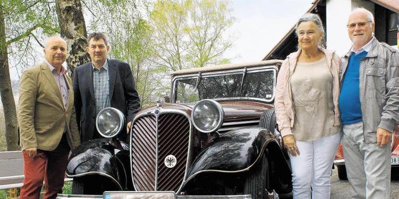 Na zdjęciu od lewej: fan Stoewera i założyciel muzeum Manfried Bauer, fan muzeum, mieszkaniec ulicy Stoewera w Wald-Michelbach Andreas Kurch, wnuczka Emila Stoewera Jutta Barckmann, jej mąż, Manfred Barckmann. Pośrodku główny bohater Stoewer-Cabrio R 150.